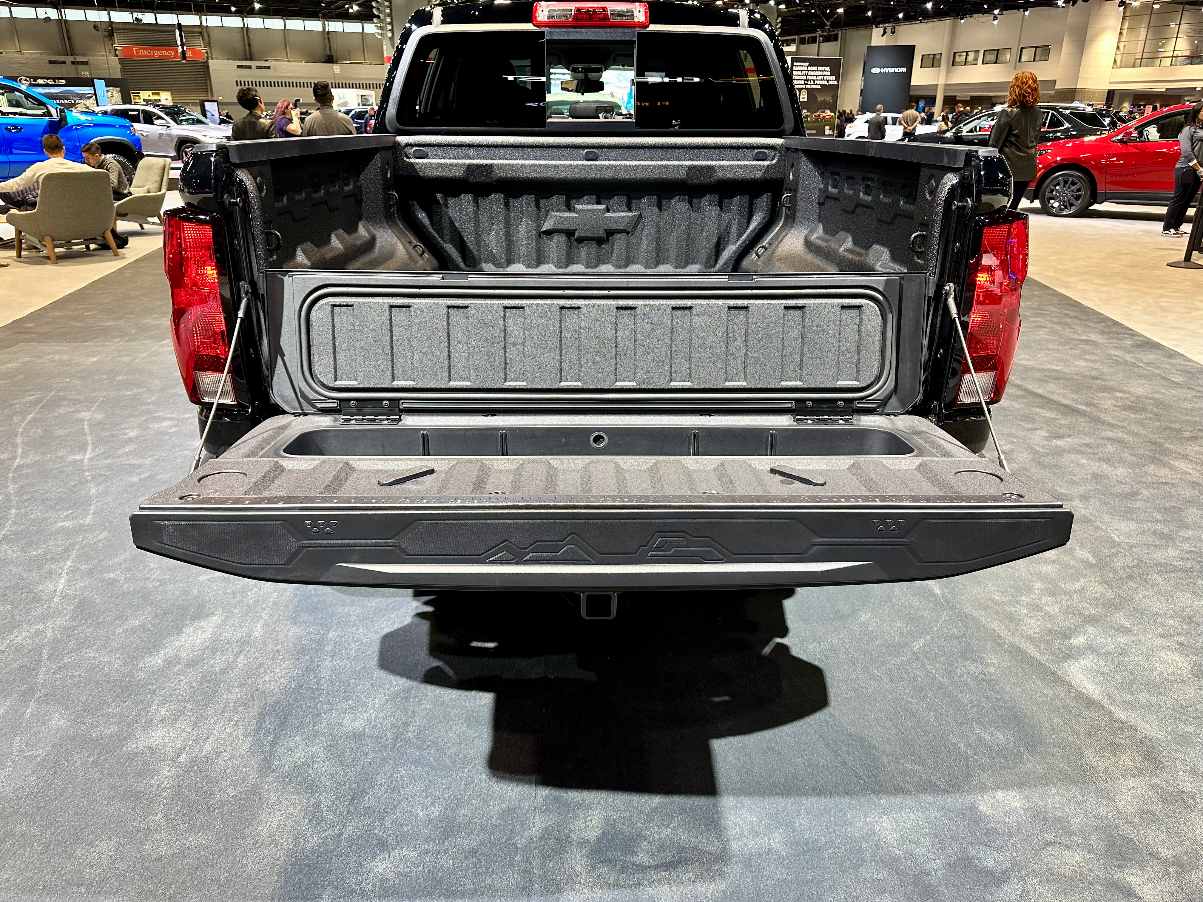 The tailgate wars have made their way down to the midsize segment. The Colorado makes its tailgate stand apart from the rest with an industry-first in-tailgate storage solution. Hidden under a flap inside the tailgate, this storage cubbie is large enough for essential tools, jumper cables, or a tailgate cooler thanks to its drain plug.