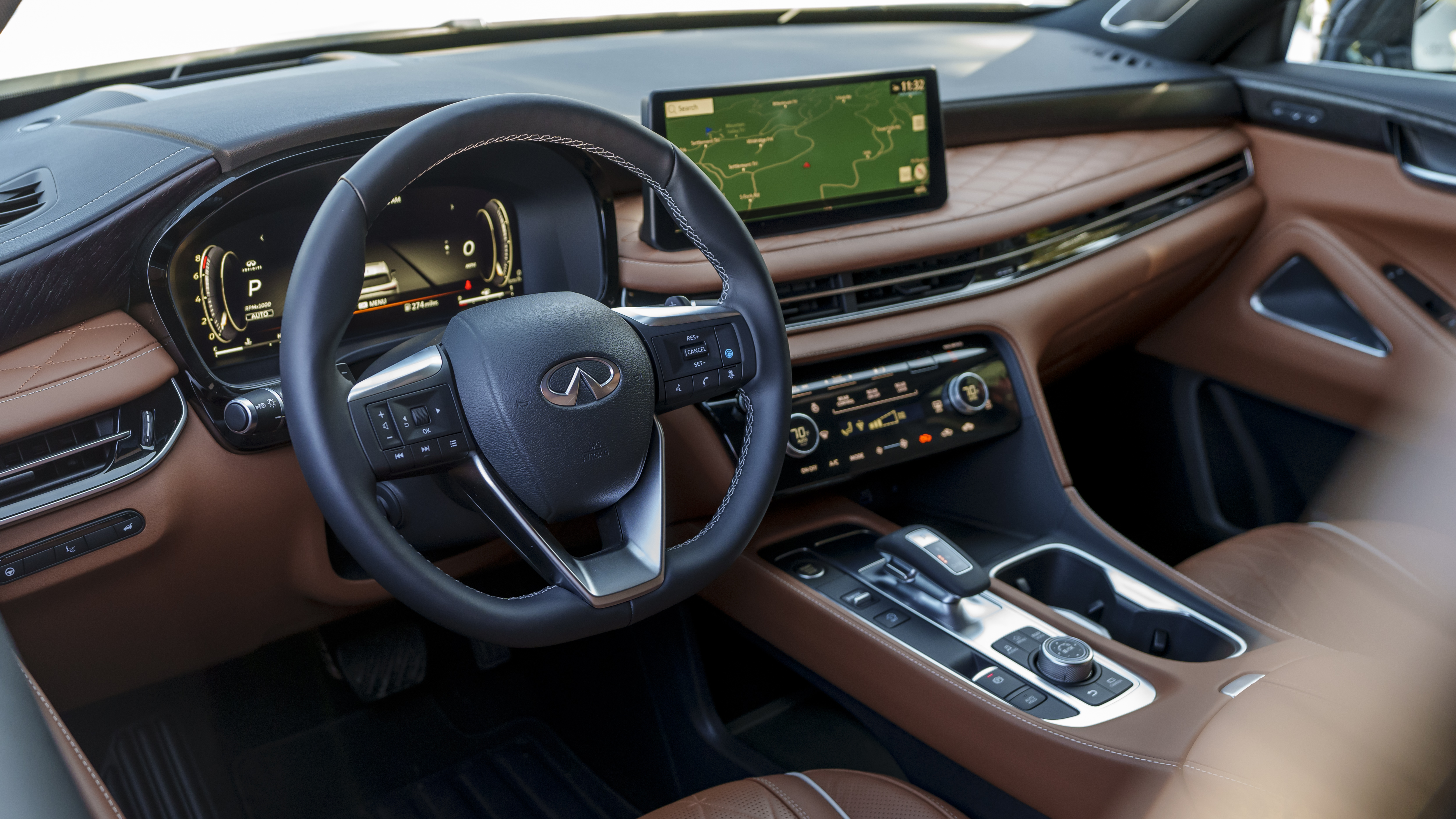 Luxury abounds in the QX60 Autograph, from all the leather on the seats and dash to the head-up display, fully digital instrument cluster, and the 12.3-inch infotainment screen.