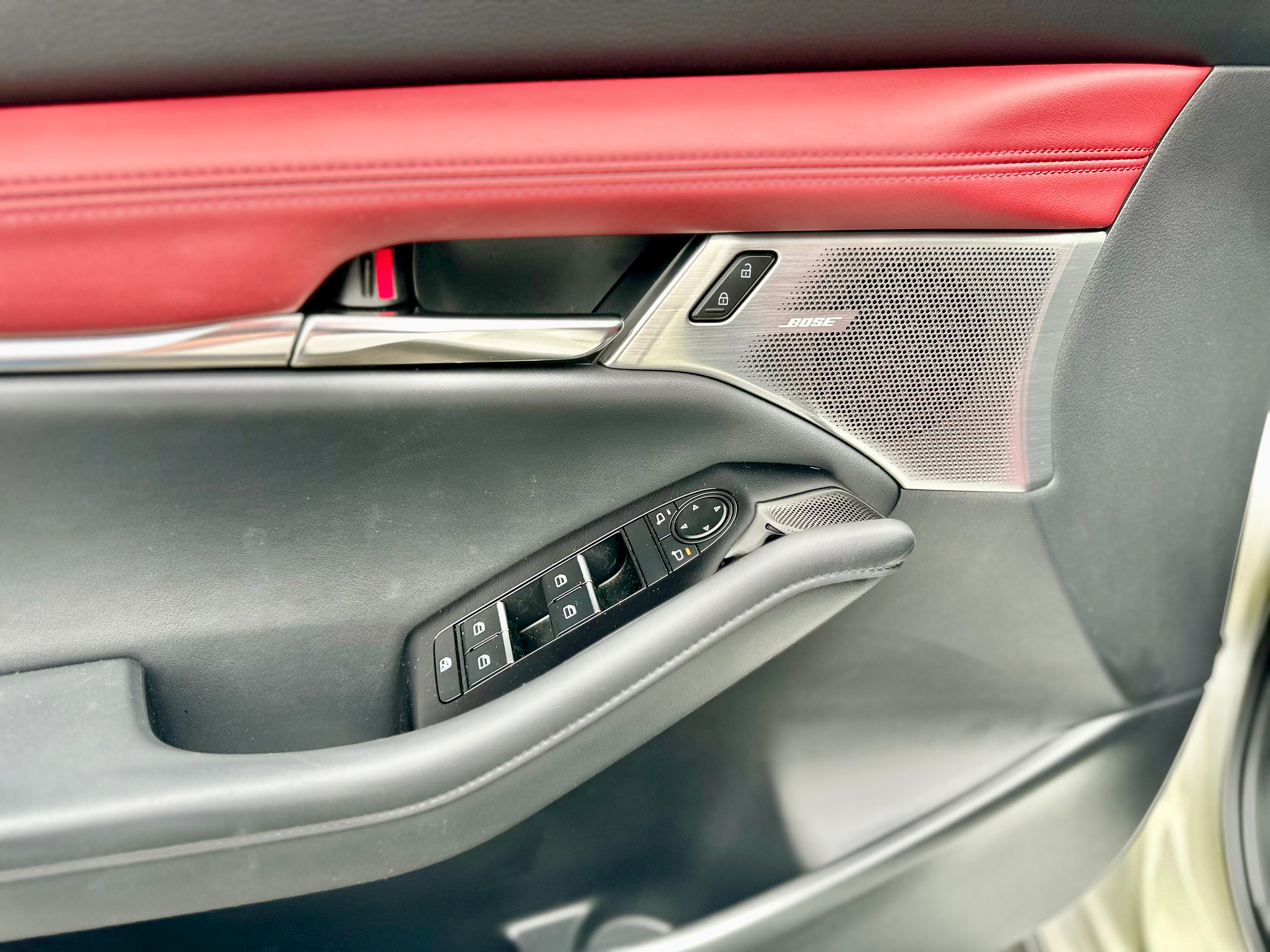 Inside the cabin, the Mazda3 Hatchback offers perforated leather seats for five, with heated front seats and steering wheel for added comfort. The power driver’s seat comes with 2-person memory, making it easy to find your ideal driving position every time you get behind the wheel, no matter who drove it last. The 8.8-inch infotainment screen is getting a little small by modern standards, though it did feature wired Apple CarPlay and Android Auto. Controls for the infotainment and the Bose premium 12-speaker audio system are in the center console behind the shifter for quick access while driving.