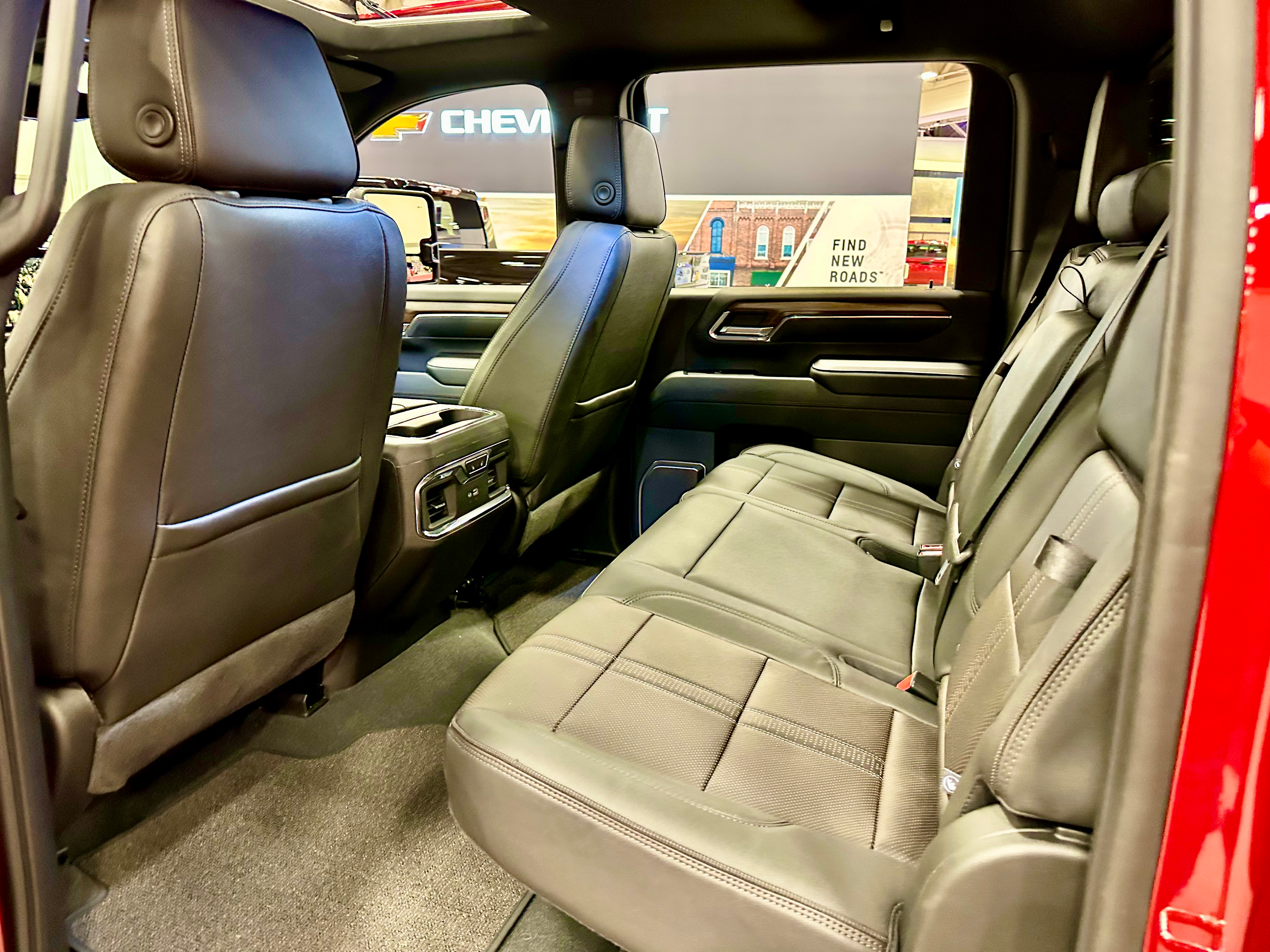 Chevy has committed to horizontal screens to emphasize the width of their pickups and this 3500 is definitely wide enough for 3 across in the upgraded rear seat. With a fold-down center armrest and hidden storage behind both outboard seat backs, the rear seat has options for storing and hiding more gear; not to mention the easy-to-flip-up seat bottom with under-seat storage.